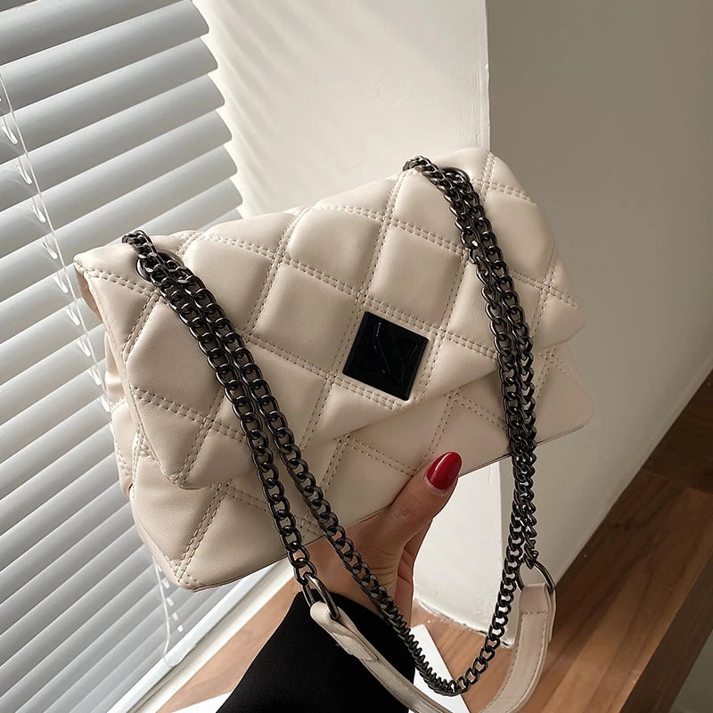 This small bag is a perfect accessory for any outfit. It features a rhombus pattern and a stylish chain strap.