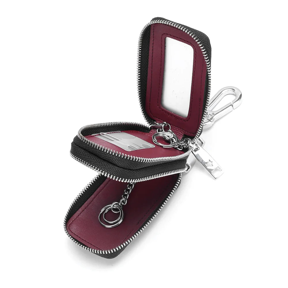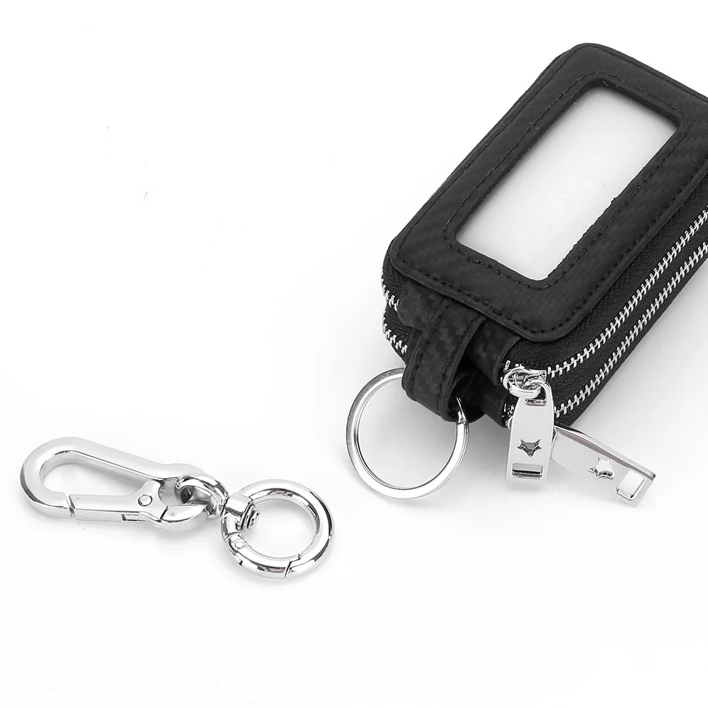 Keep your keys organized and secure with this stylish carbon fiber textured leather key holder. Features double zipper compartments for added convenience.