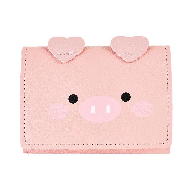 Adorable cartoon pig design small wallet made of soft leather, perfect for students. Features three-fold design with card slots and zero wallet compartment.