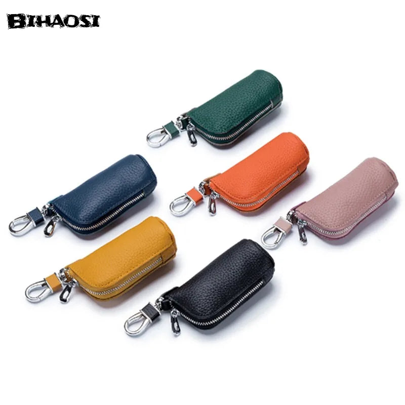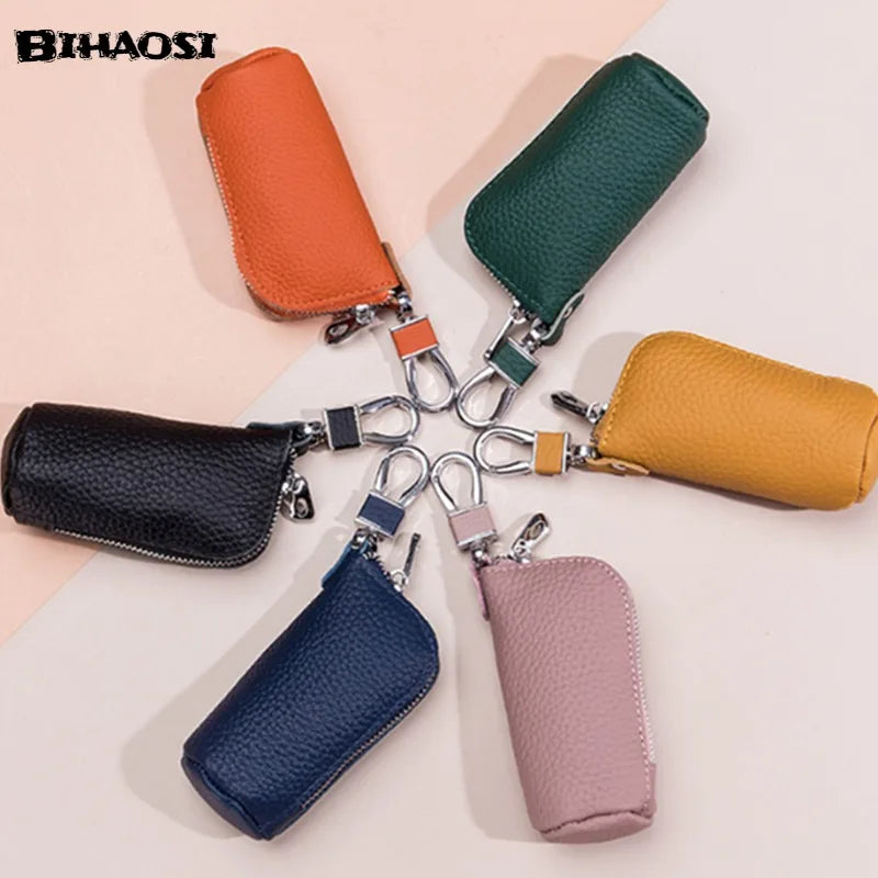 This practical household key bag is made of durable cowhide leather and can be used as a wallet, lipstick bag, keychain, and coin purse.