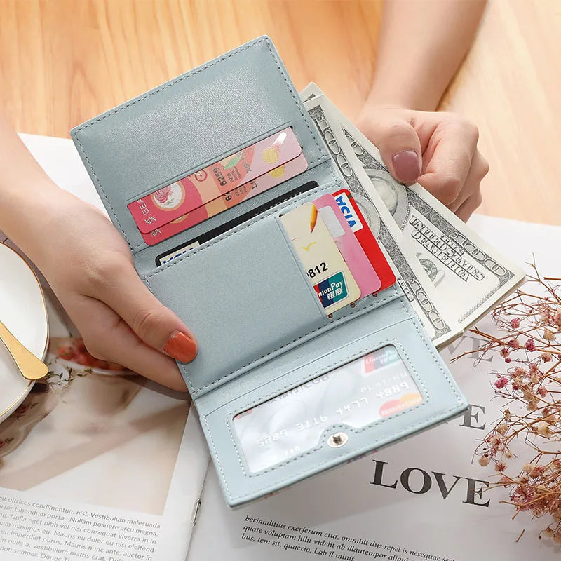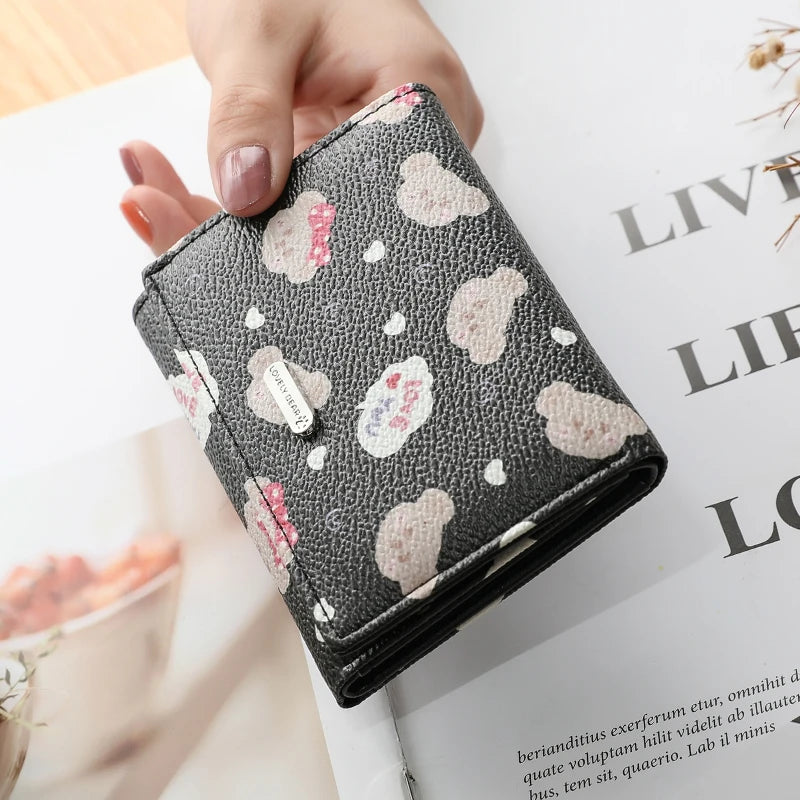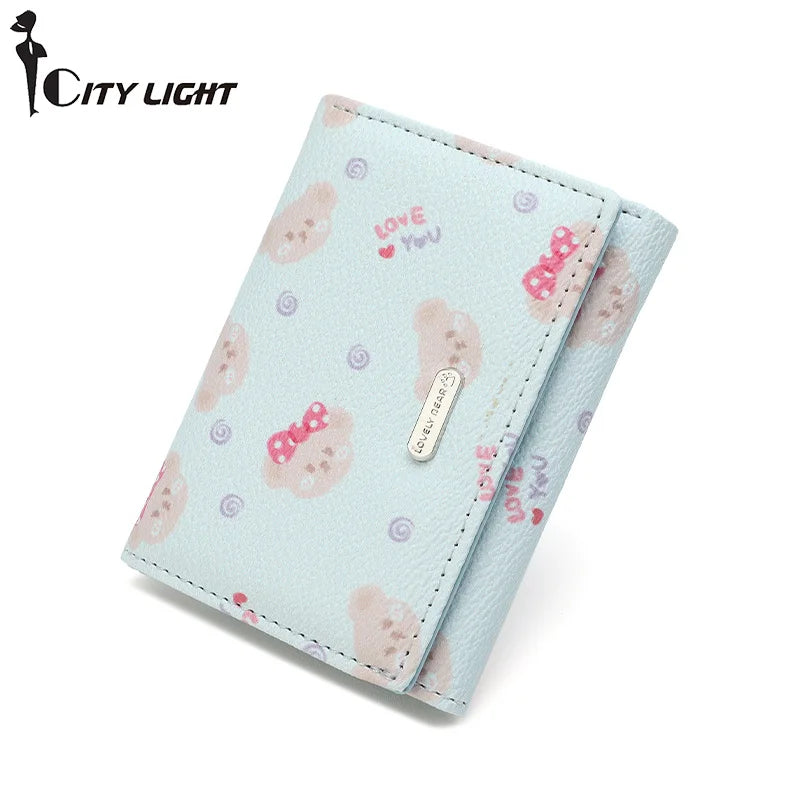 This adorable short wallet features a cartoon bear design with a hasp closure. It has multiple compartments for cards, cash, and coins, making it perfect for students.