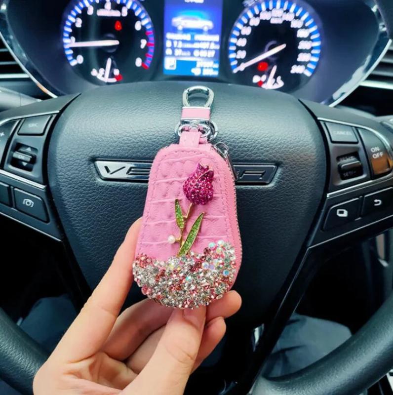 Keep your keys safe and secure with this stylish Diamond Flower Key Case. Made of high-quality leather with a beautiful crystal design, this key wallet is perfect for storing your car keys, house keys, and more.