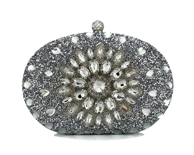 Add a touch of sparkle to your evening outfit with these sequined egg-shaped clutch bags featuring diamond sunflowers. Available in 5 colors to match any wedding or special occasion attire.
