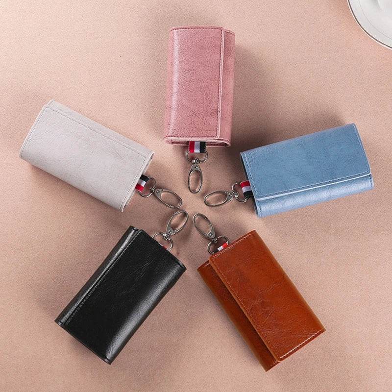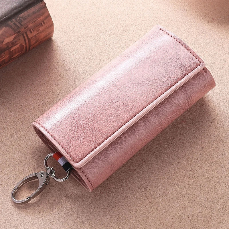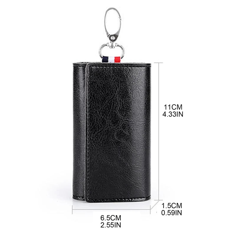 Protect and organize your car keys in style with this faux leather case. Features a metal hook keychain and button closure.