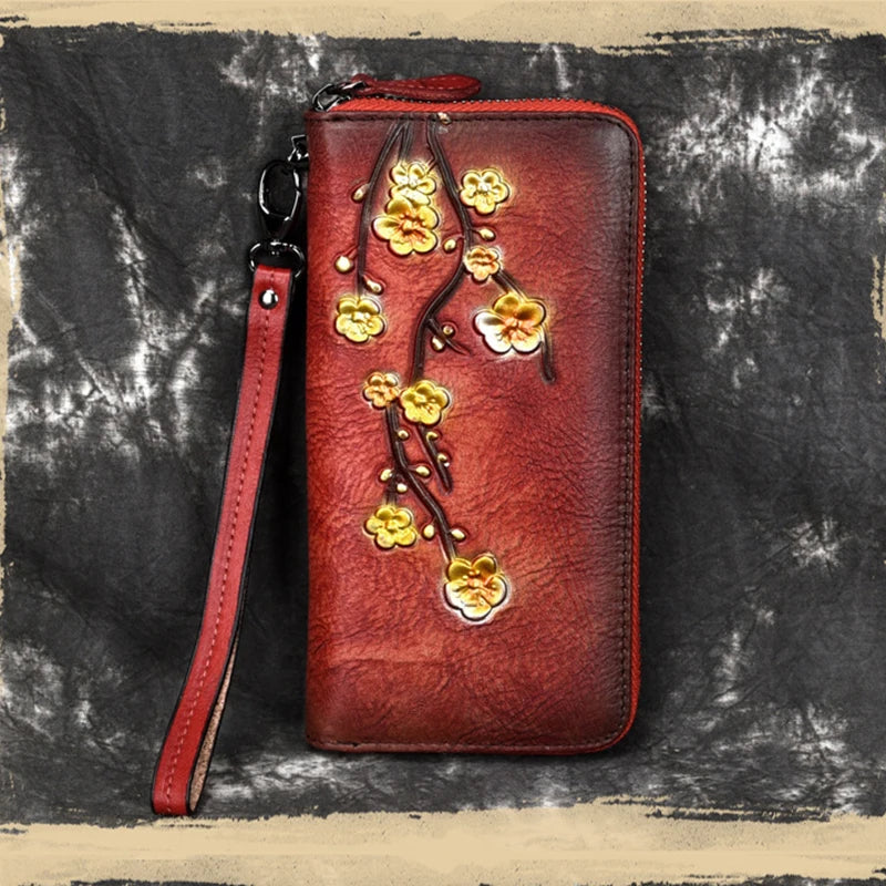 Elegant and stylish long wallet with floral design, perfect for parties or evening events. Features a zipper closure and wrist strap for convenience.