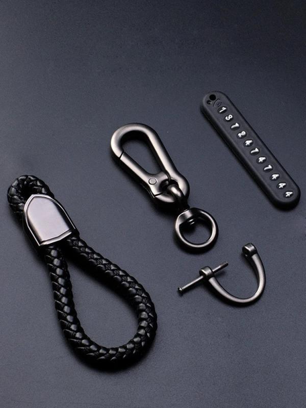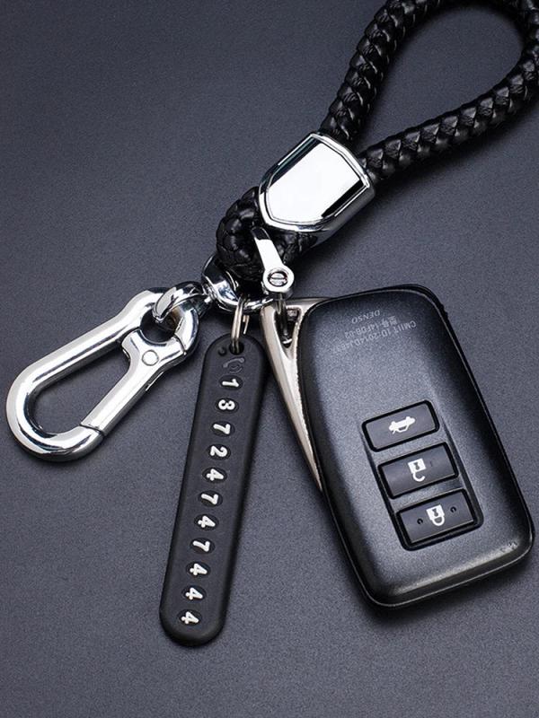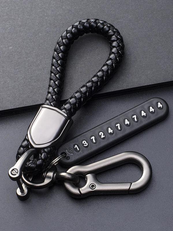 This unisex key wallet holder is made of hand woven leather and features a 360 degree rotating metal clasp. The anti-lost number plate key rings add extra security.
