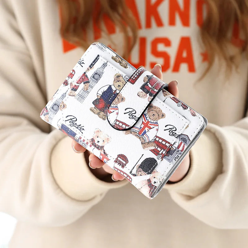 This cute and stylish short wallet features a cartoon bear buckle design, ideal for students. It has a mini size with a zipper closure, perfect for carrying money and small items.