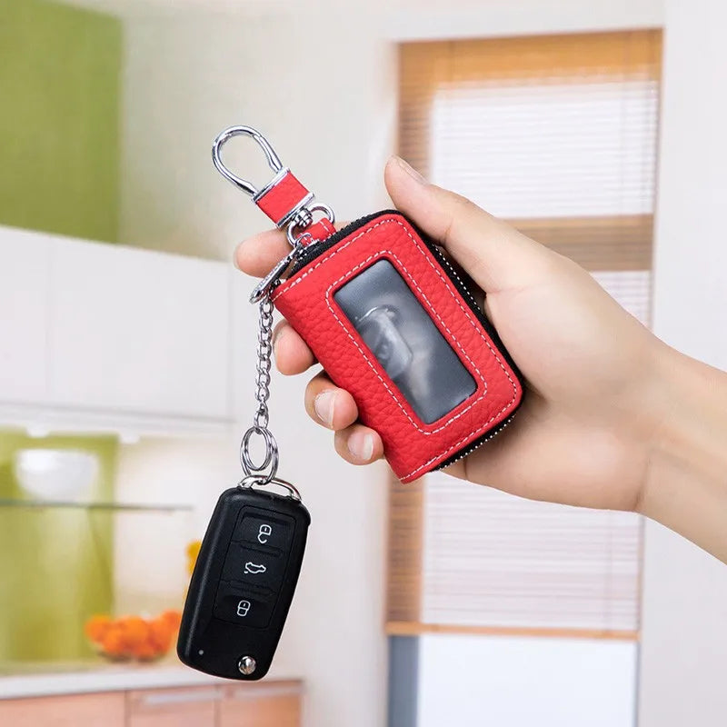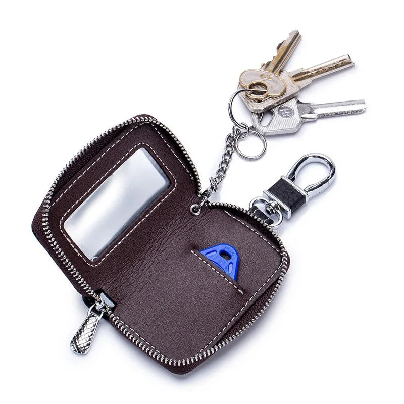 Keep your car key safe and stylish with this leather key holder featuring a transparent key box and zipper pocket. It also serves as a remote control protector and can be worn on your waist.