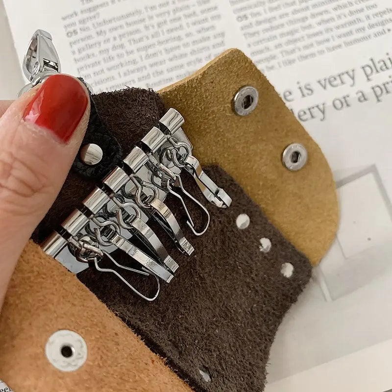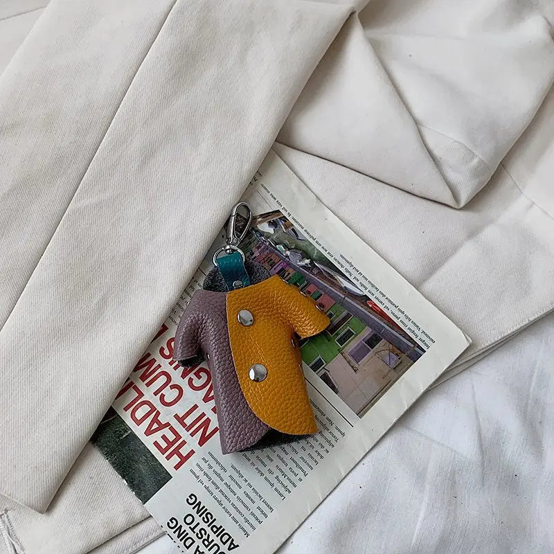 This mini keychain holder bag case is made of 100% leather, providing a stylish and durable storage solution for your car keys. It features a solid design and can also be used as a wallet cover.