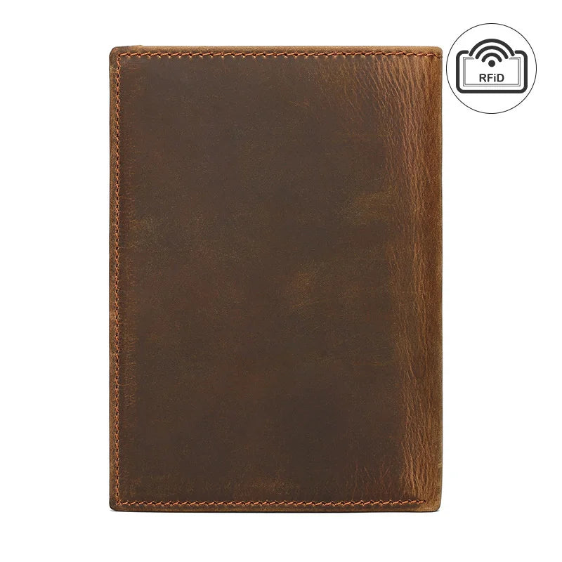 This stylish passport bag is made of high-quality crazy horse leather and features a multi-function card wallet, air ticket pocket, and change compartment.