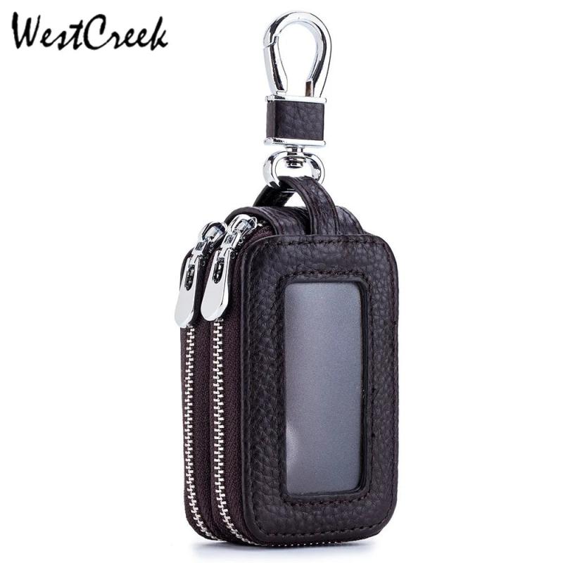 Litchi Cowhide Car Key Wallet Double Zipper Organizer Key Chain Holder