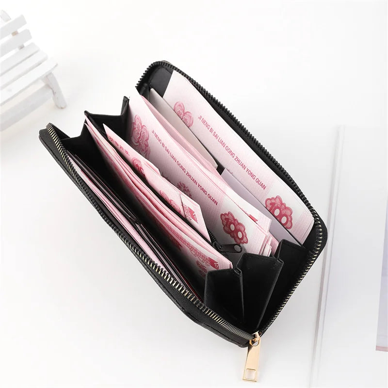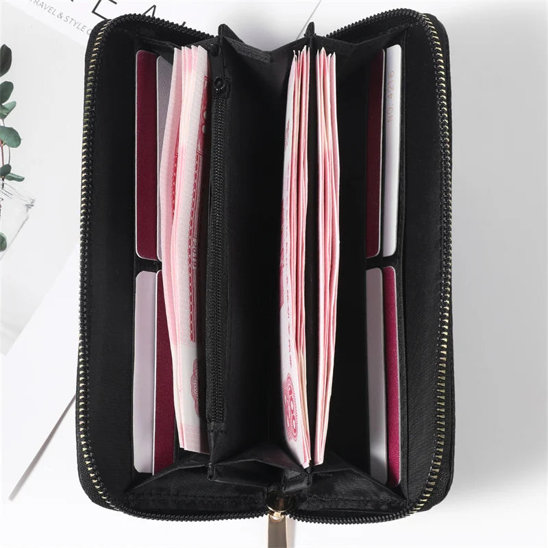 This unisex casual long clutch bag is made of high-quality PU leather with beautiful embroidery. It features an anti-theft design and includes a brush storage bag for added convenience.