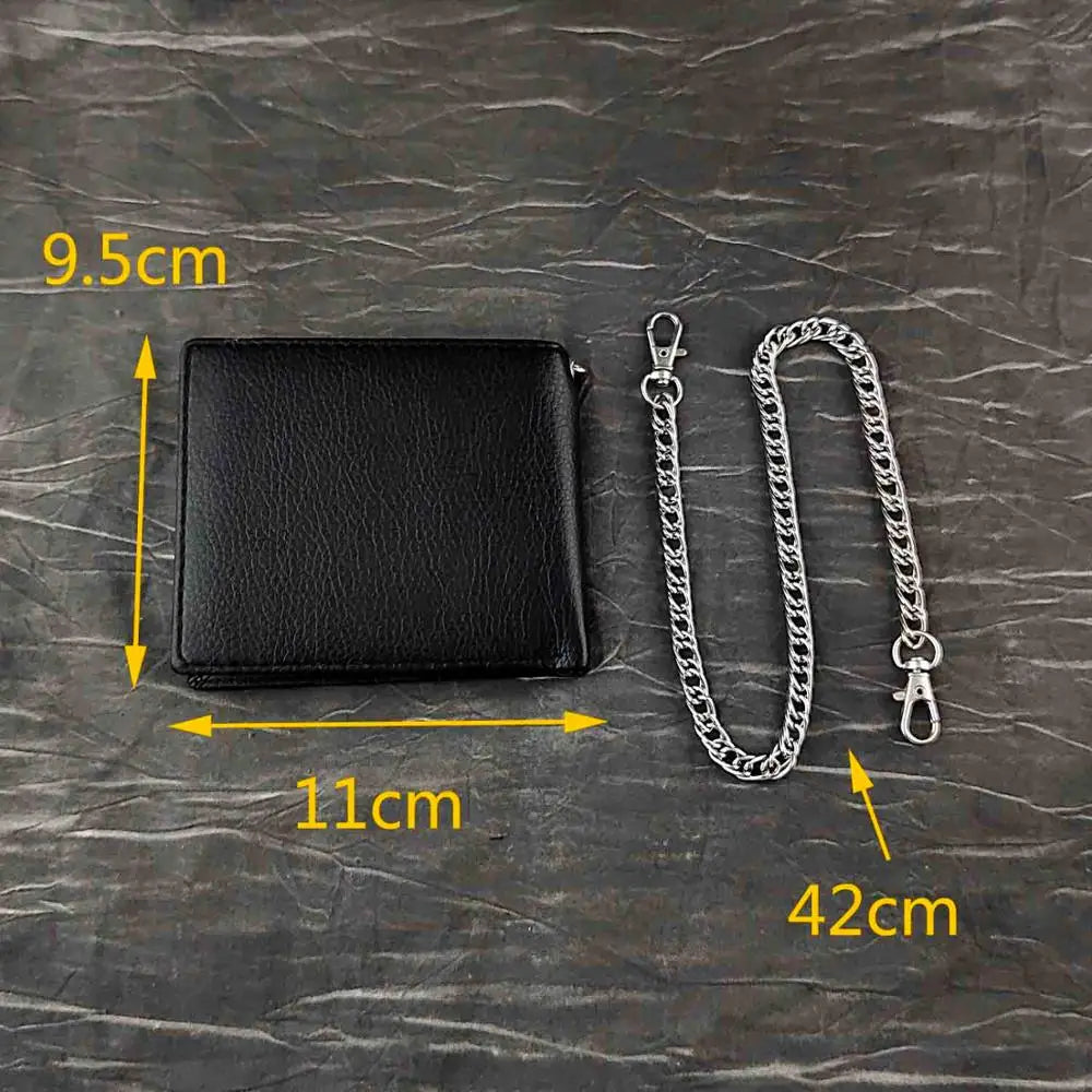 Stay organized and secure with this slim bifold wallet featuring a gunmetal metal chain. Made from high-quality leather, this wallet is both stylish and functional.