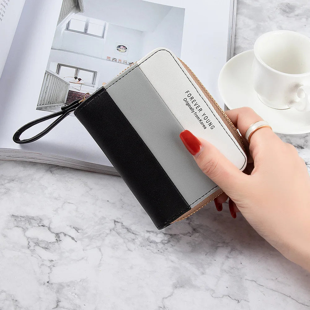 This female purse is a short version of small fresh splicing wallet with integrated design. It features a zipper, zero wallet, and multiple card slots for convenience.