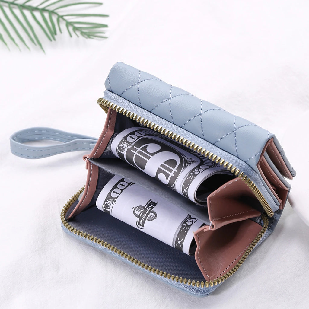 This stylish trifold short wallet is perfect for parties, dating, and afternoon tea. Made of high-quality PU leather, it features a convenient wrist strap for easy carrying.
