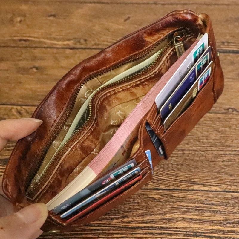 This vintage wallet is made of top layer cowhide and features a multi-card soft bag design with a zipper bifold. Perfect for daily wear, this wallet is both stylish and functional.