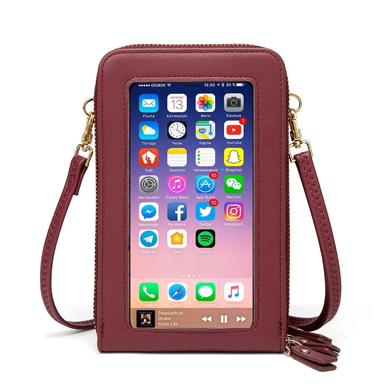 This women's phone bag combines style and functionality, featuring a touch screen design for easy access. Made of soft leather, it offers a large capacity to hold your essentials.