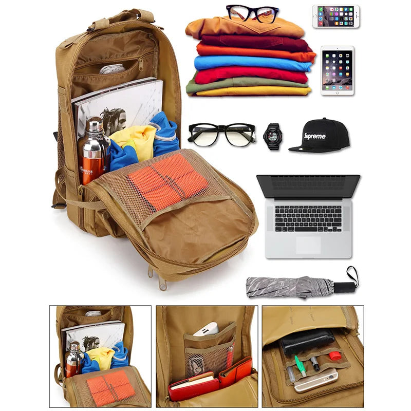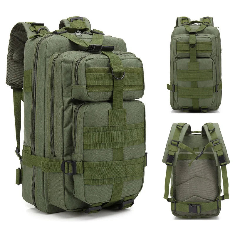 This 25L military tactical backpack is designed for outdoor activities like hiking, camping, and survival scenarios. It features a durable construction, waterproof material, and MOLLE system for customization.