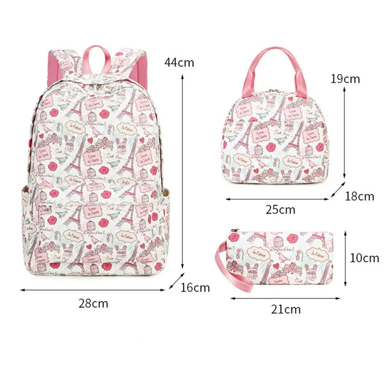 Description:This lightweight water-resistant backpack set is perfect for female students. Made of durable polyester material with stylish printing, it offers ample space for books and essentials.Features: 3-piece set including backpack, shoulder bag, and pencil case Water-resistant and easy to clean Adjustable padded shoulder straps for comfort Multiple compartments for organization...
