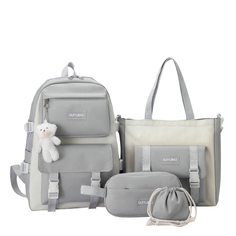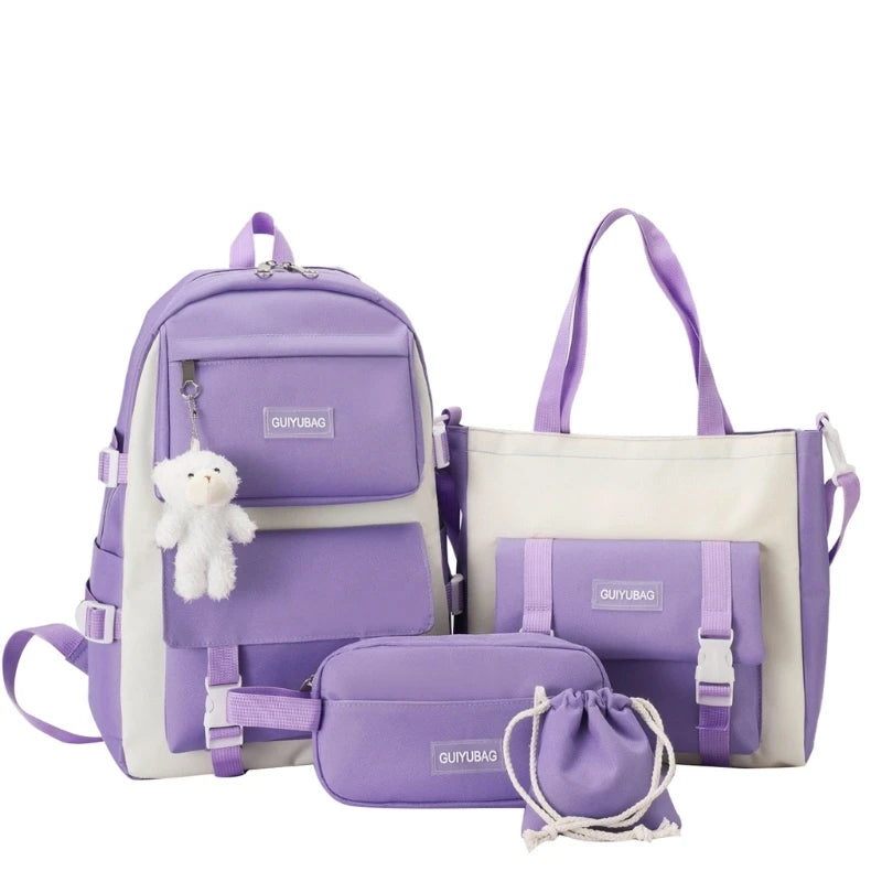 Get this stylish 4-piece set including a backpack, handbag, pencil case, and drawstring bag designed for students, especially girls.