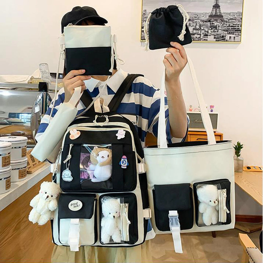 - Includes cartoon doll backpack, shoulder bag, wallet, drawstring bag, and coin purse