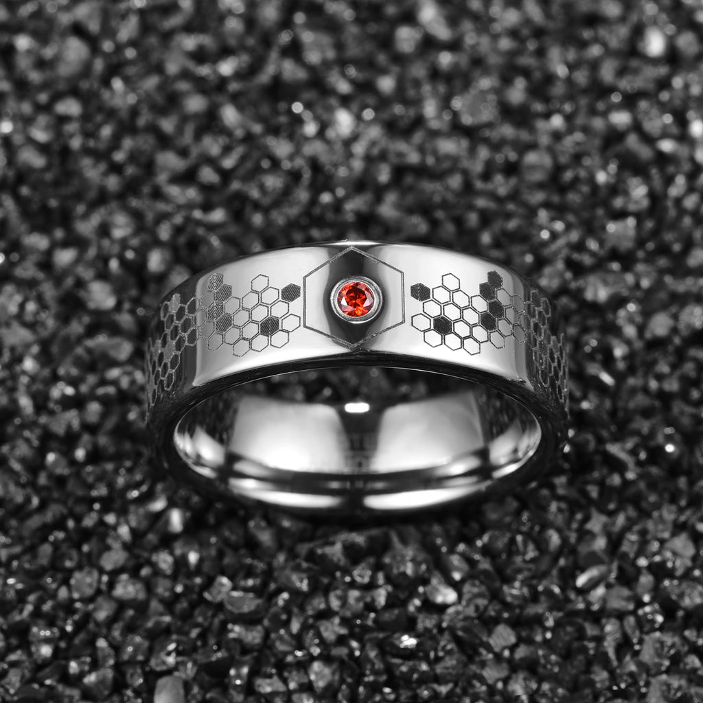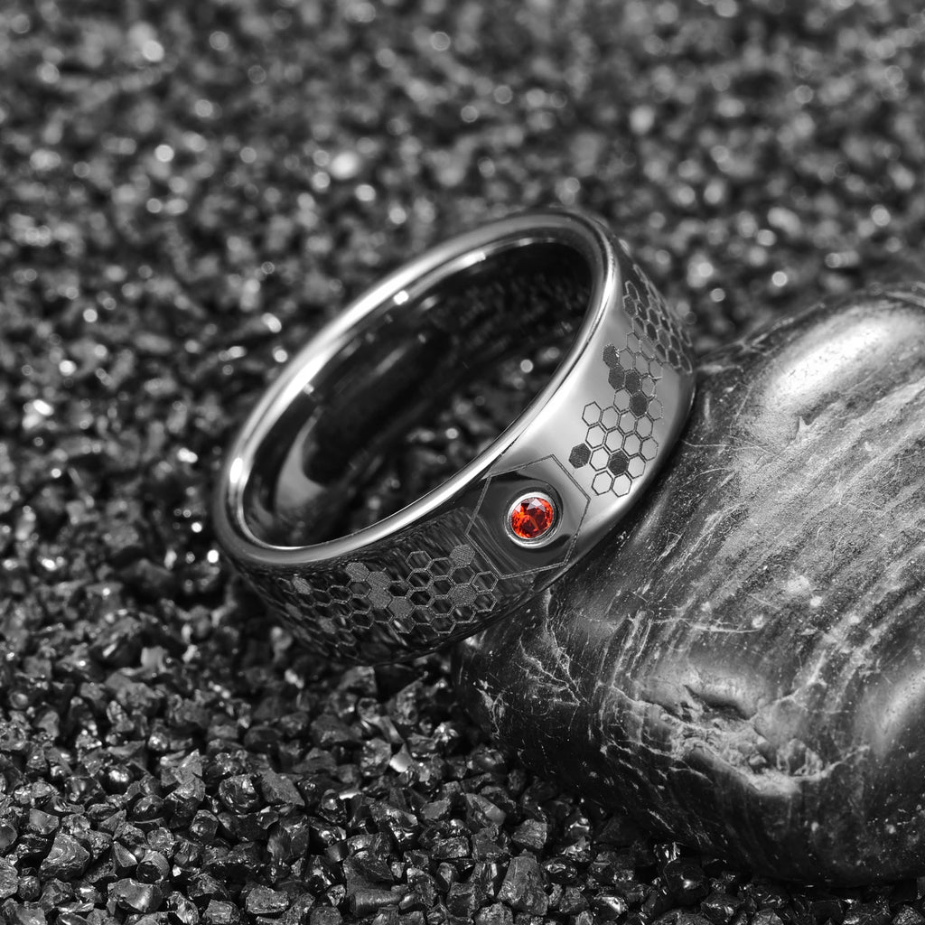 This ring features red zircon stones in an organic molecular pattern on tungsten steel, making it a unique wedding jewelry gift for men.