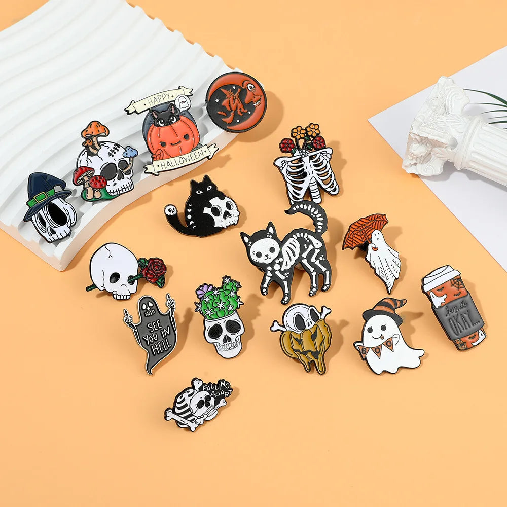 Add a spooky touch to your bags or clothing with these personalized Halloween series alloy brooches featuring ghosts and skulls wearing hats.