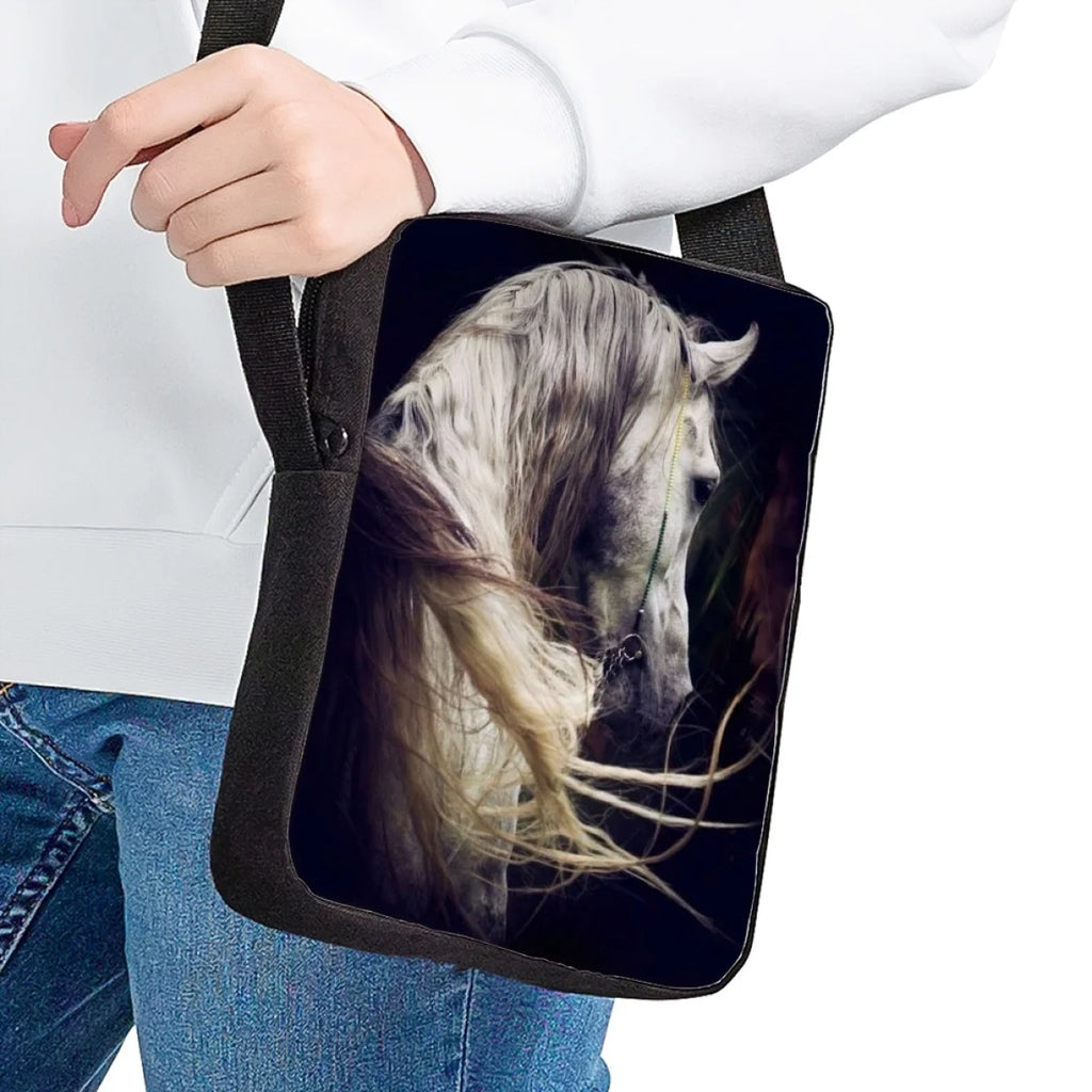 This stylish and durable school bag features a fun horse pattern, perfect for kids. Can be worn as a crossbody or shoulder messenger bag.