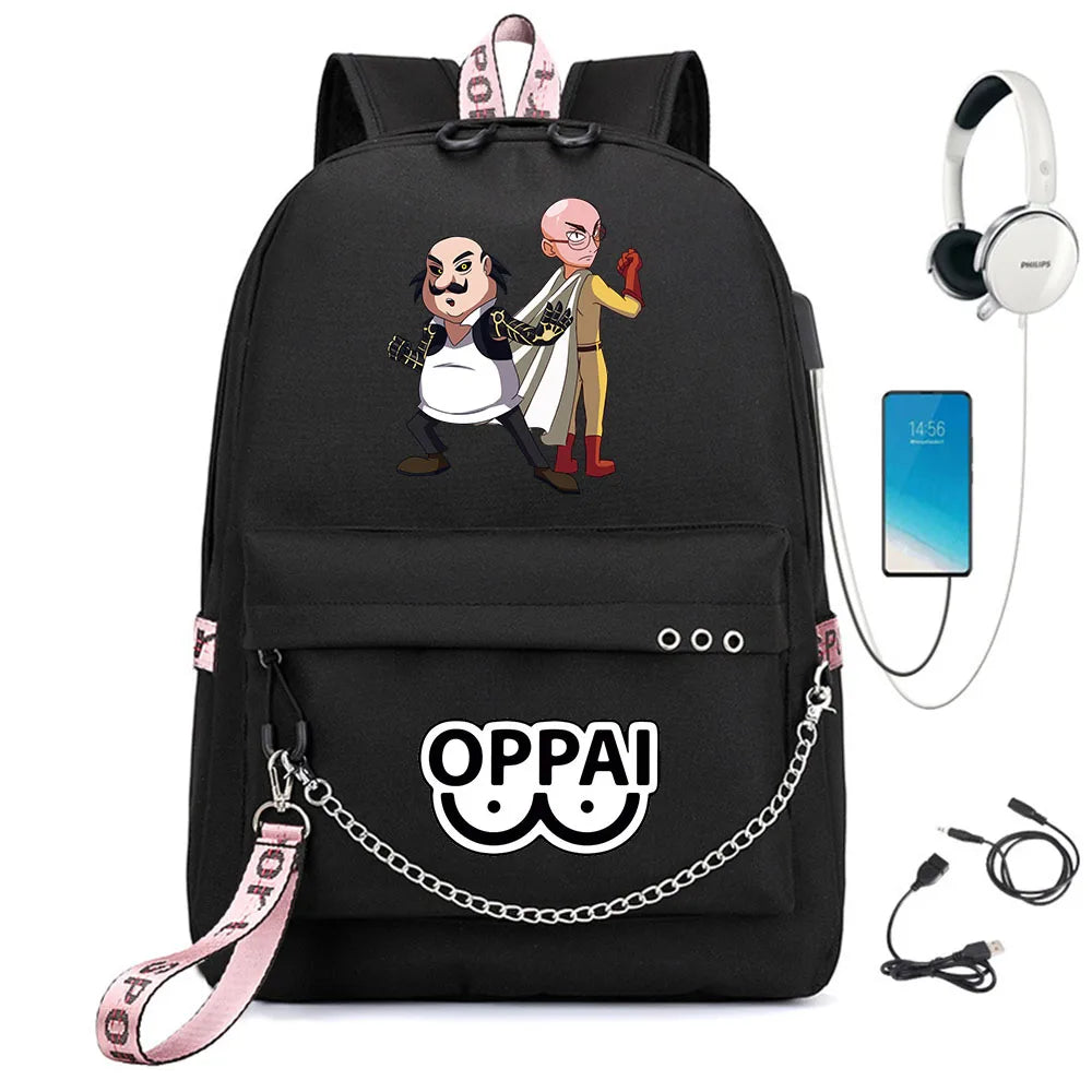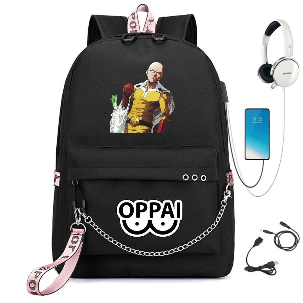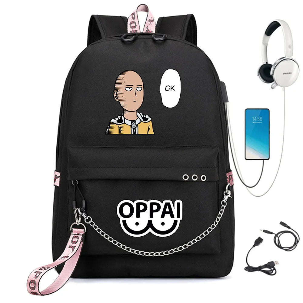 Anime One Punch-Man Backpack USB Charging Headphone Teens Student Schoolbag