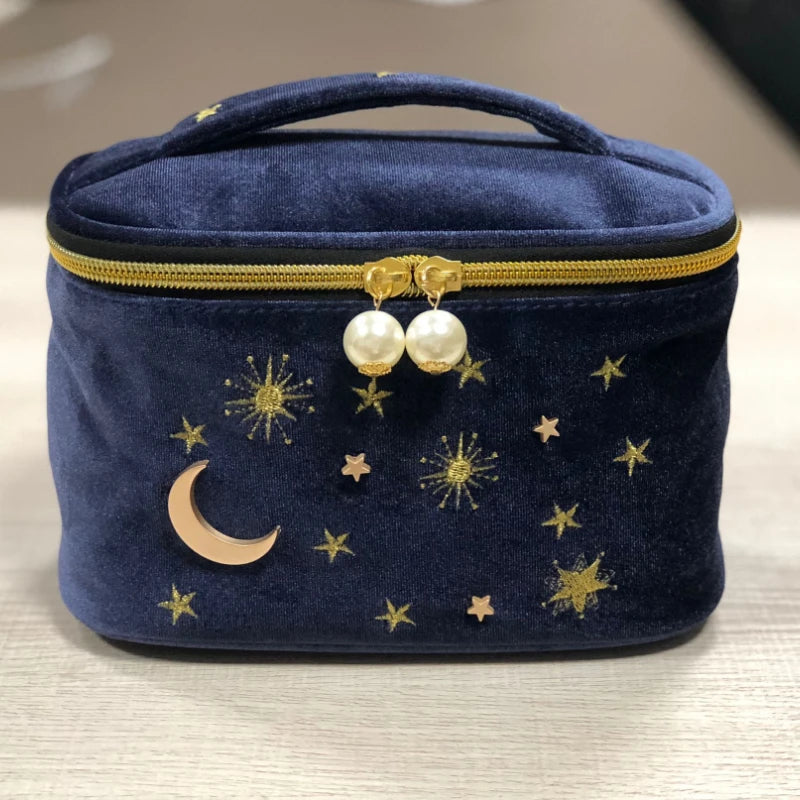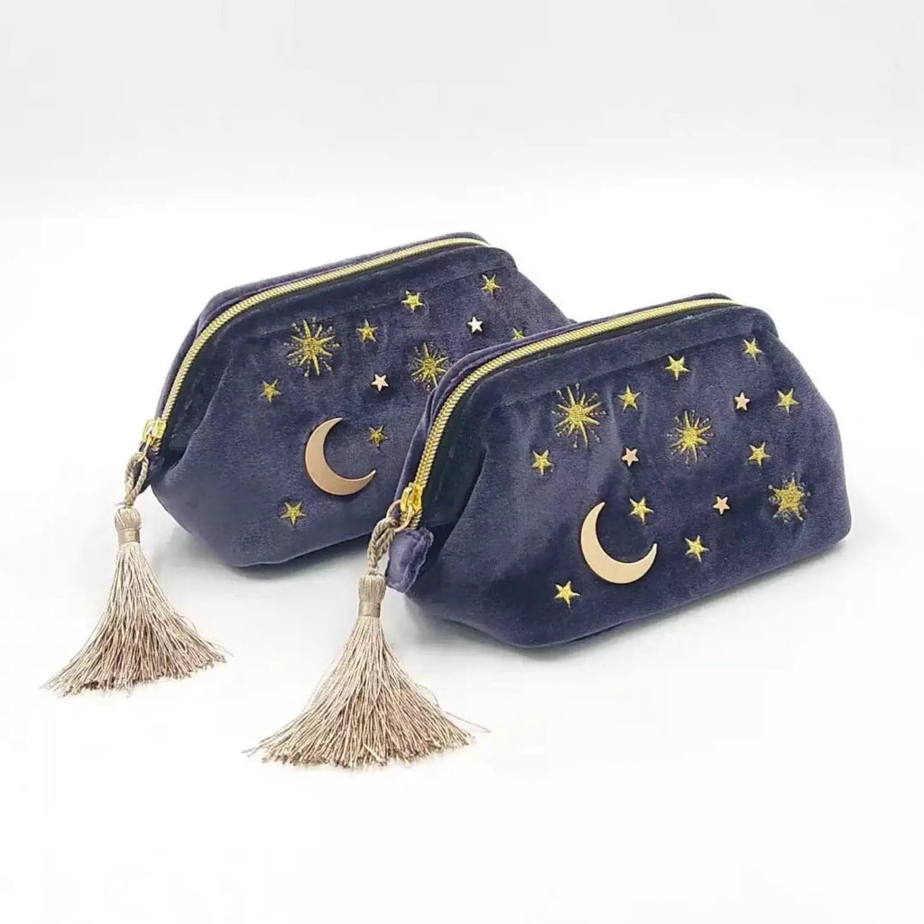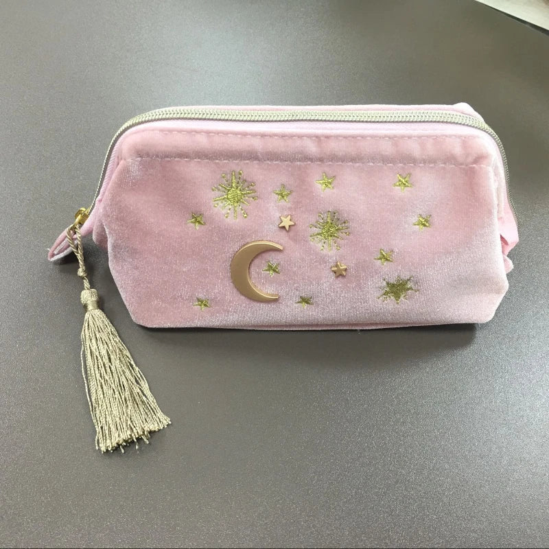This lovely velvet cosmetic bag features anime prints with star and moon embroidery. It has a tassel zipper closure and is perfect for organizing makeup while traveling.