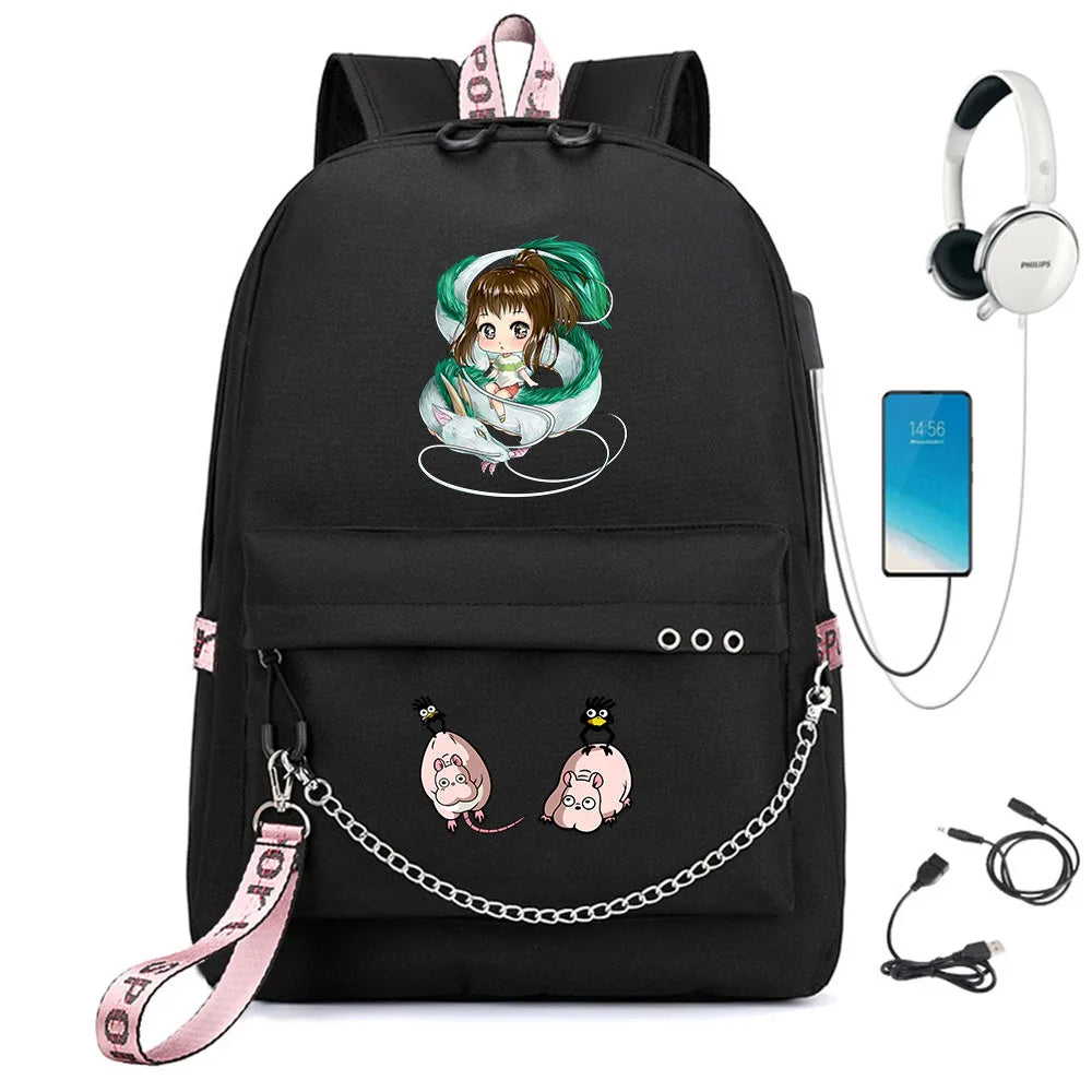 Anime Spirited Away Backpack USB Charging Headphone Teenagers Student Schoolbag
