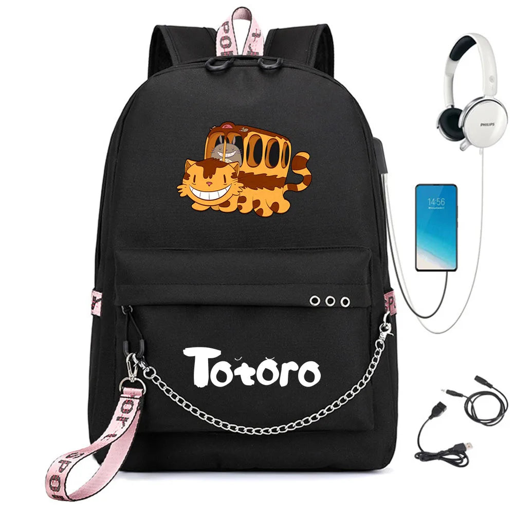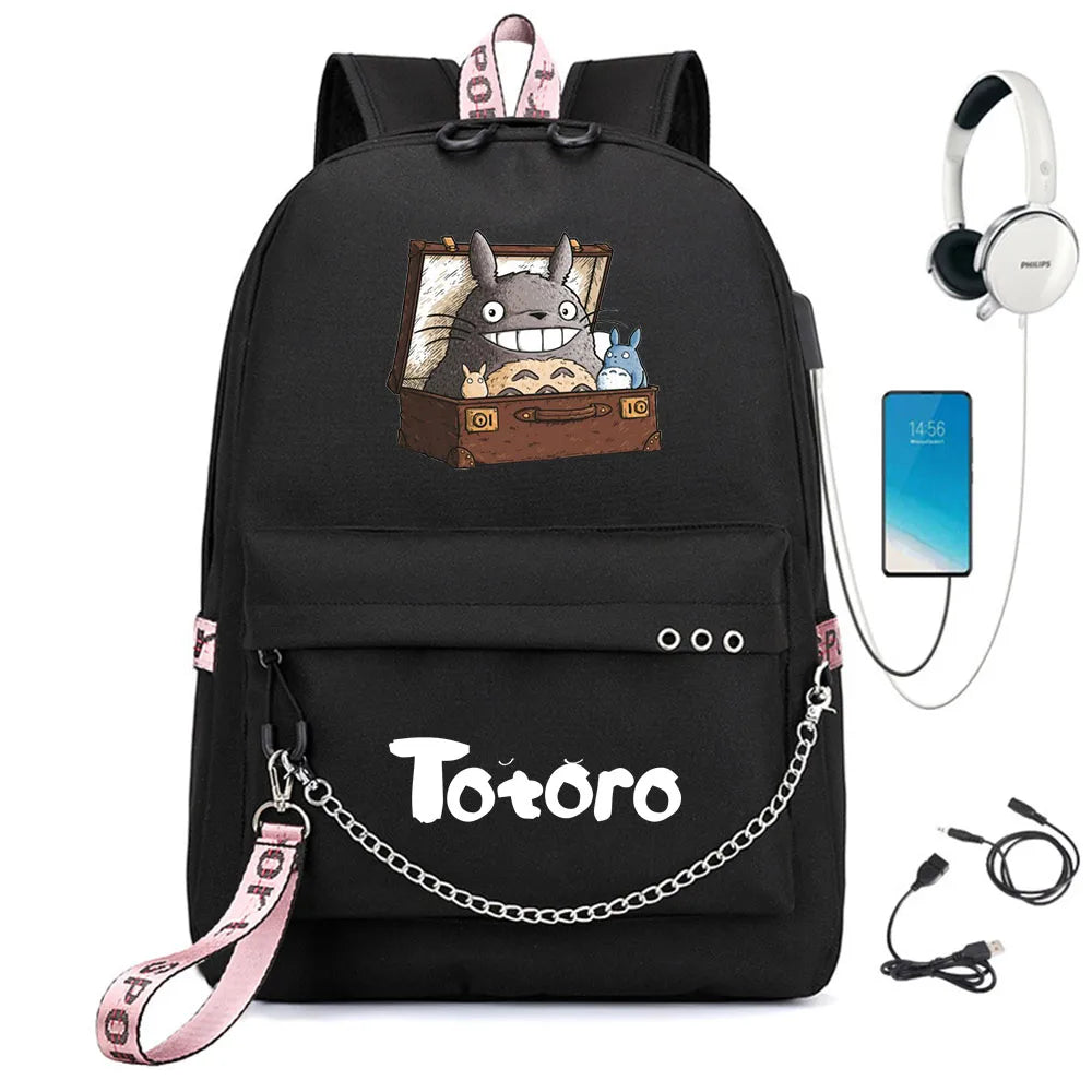 This casual backpack features a cute Totoro print design, perfect for students and travelers alike. It has a USB charging port for convenience.