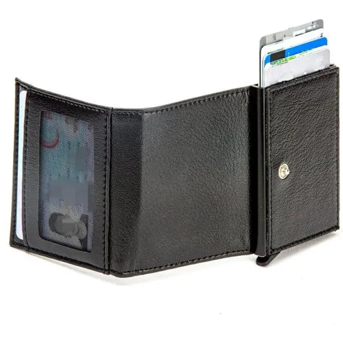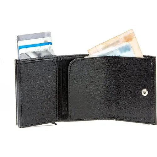 This faux leather wallet features an automatic mechanism for easy access to your cards and cash. It combines style and functionality.