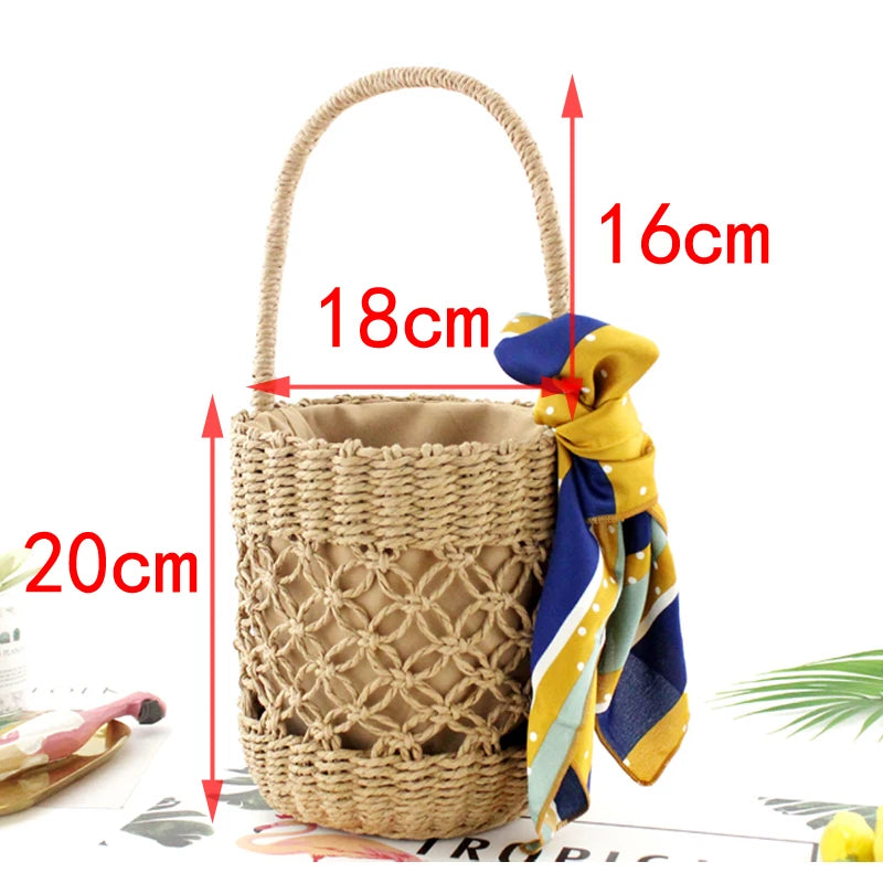 This stylish barrel-shaped woven handbag with a patterned design and hollow out details is the perfect beach accessory. The handbag features a portable straw bag with a Mori bucket silk scarf for added elegance.