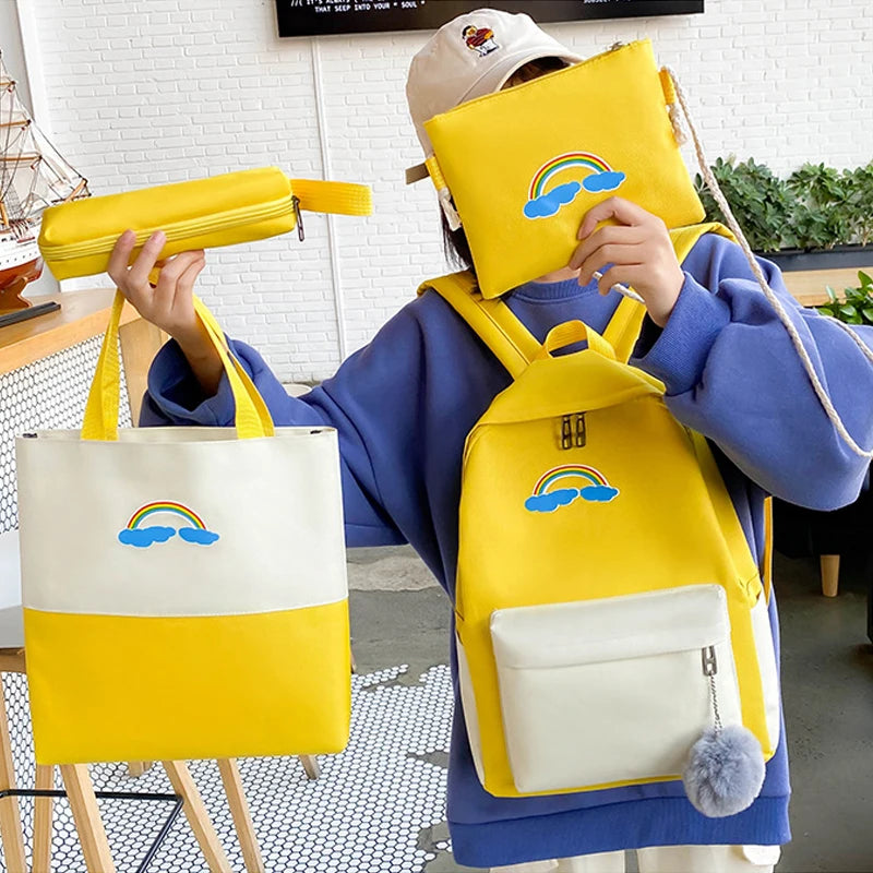 This adorable set includes a backpack, shoulder bag, pencil case, and coin purse, perfect for school or travel. The cartoon print design adds a fun touch.