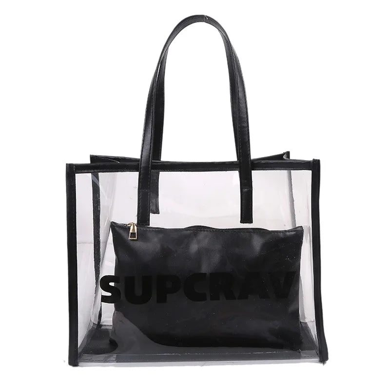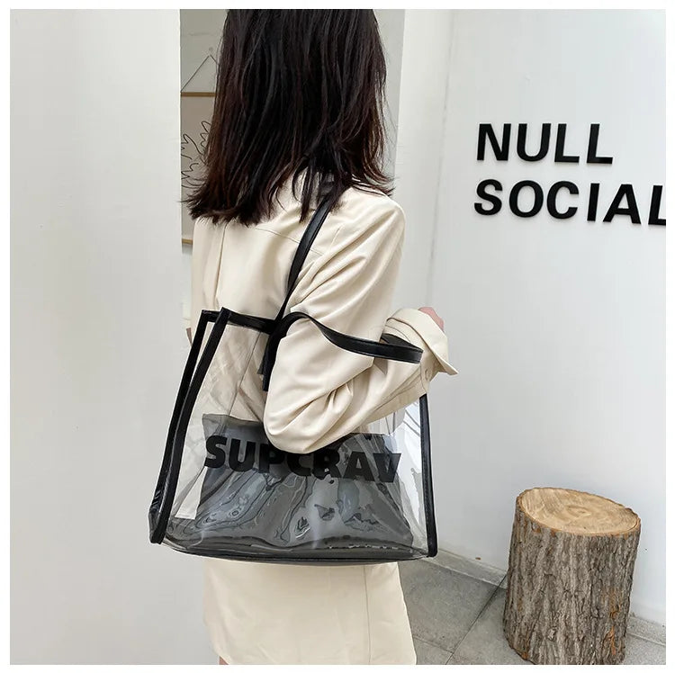 Stay stylish with this PVC letter shopping bag that is perfect for any casual outing. The transparent design adds a modern touch to your look.