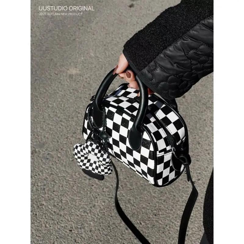 This handbag is perfect for a casual day out or for a special occasion. It features a checkerboard design and a mini flower pendant for added style.