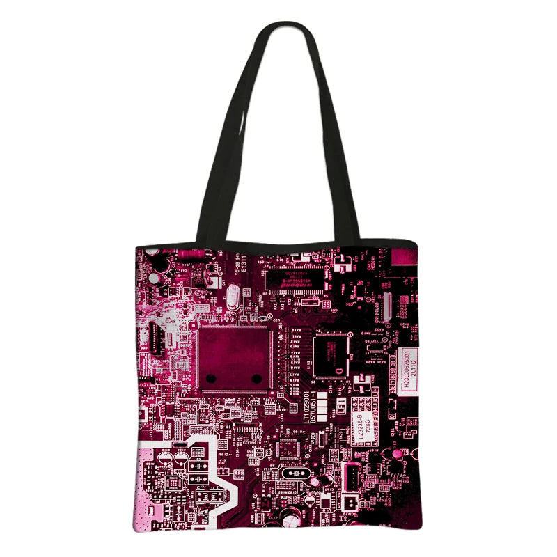 This stylish handbag features a unique design with a circuit board chip print, perfect for tech-savvy individuals. It is both functional and fashionable, making it a great accessory for any outfit.