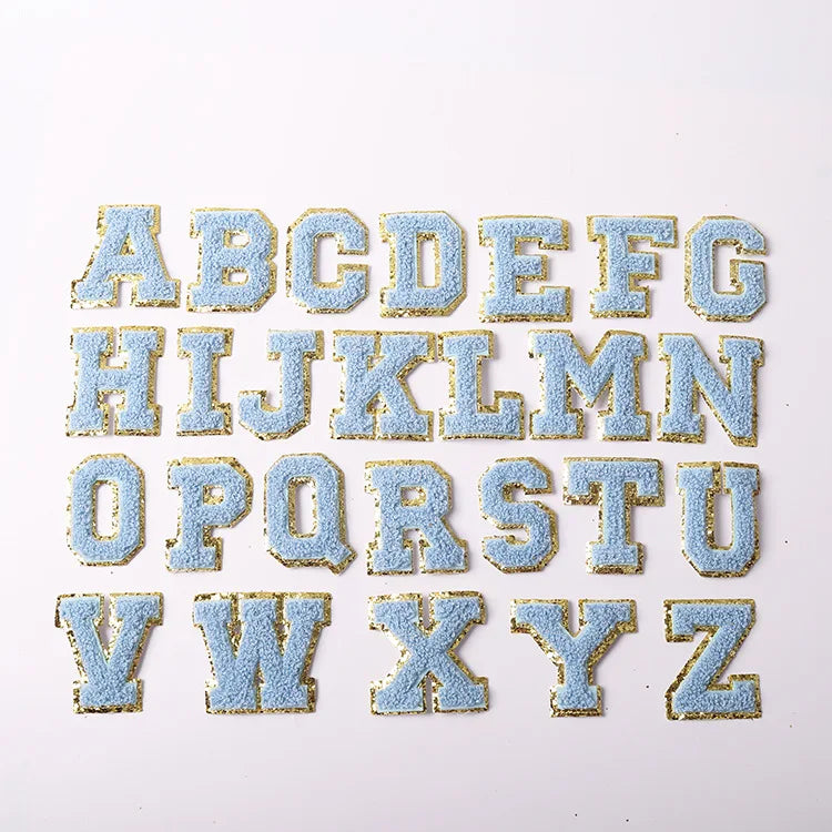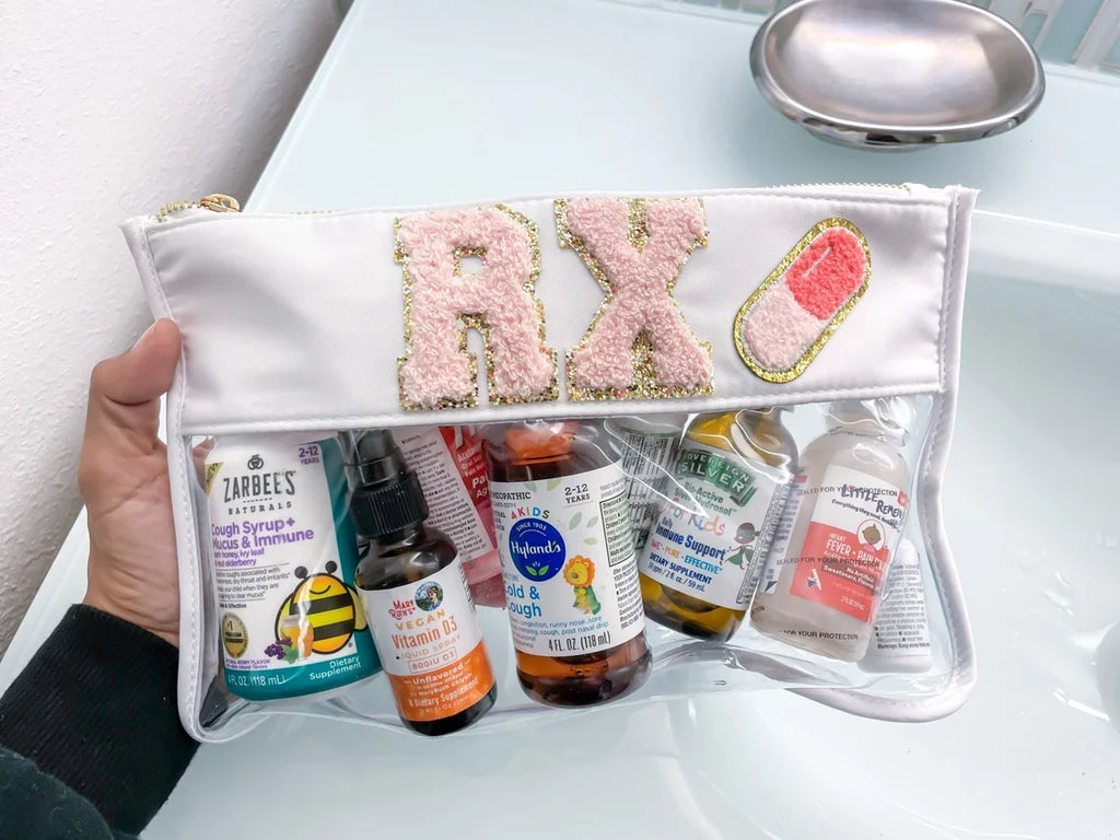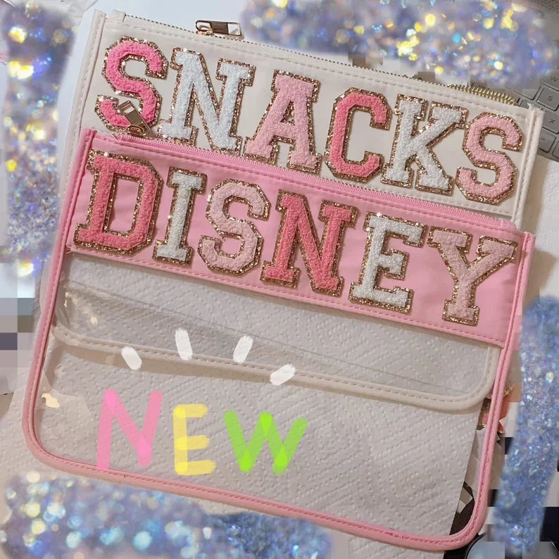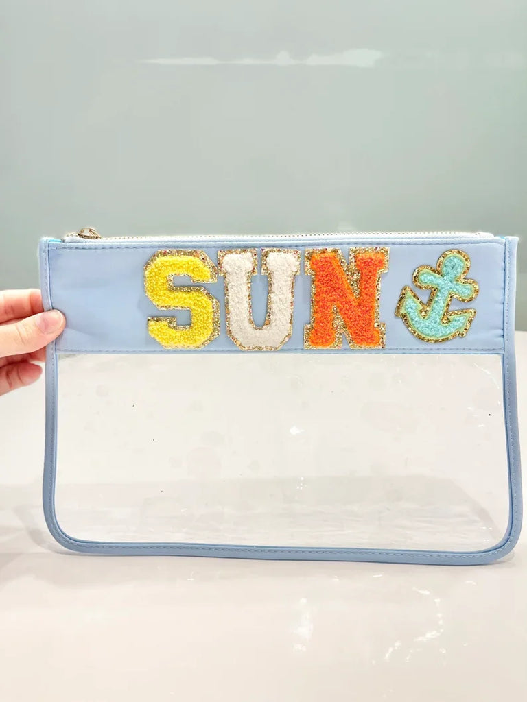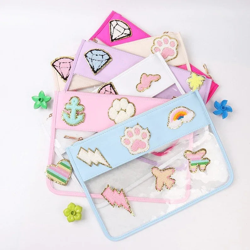• Clear nylon cosmetic bag with glitter varsity letter patches