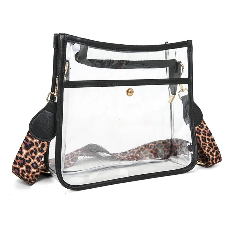 Stay on-trend with this stylish clear tote bag featuring a leopard print guitar strap. Perfect for a day out or a casual night out.