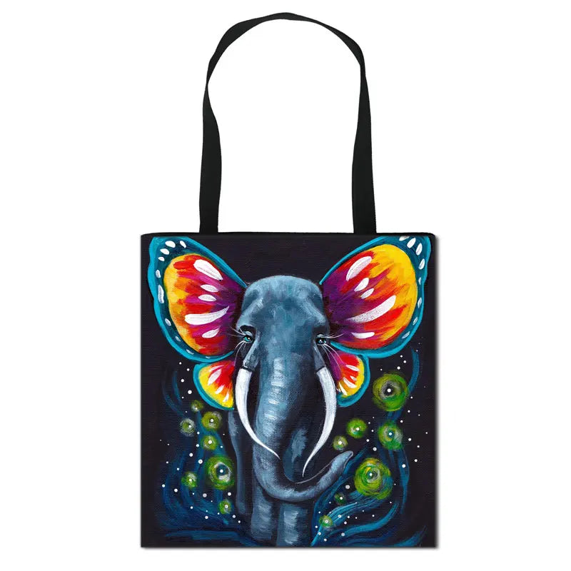 This vibrant tote bag features a colorful painting of an elephant print. It is perfect for young boys and girls and offers high capacity for all your shopping needs.