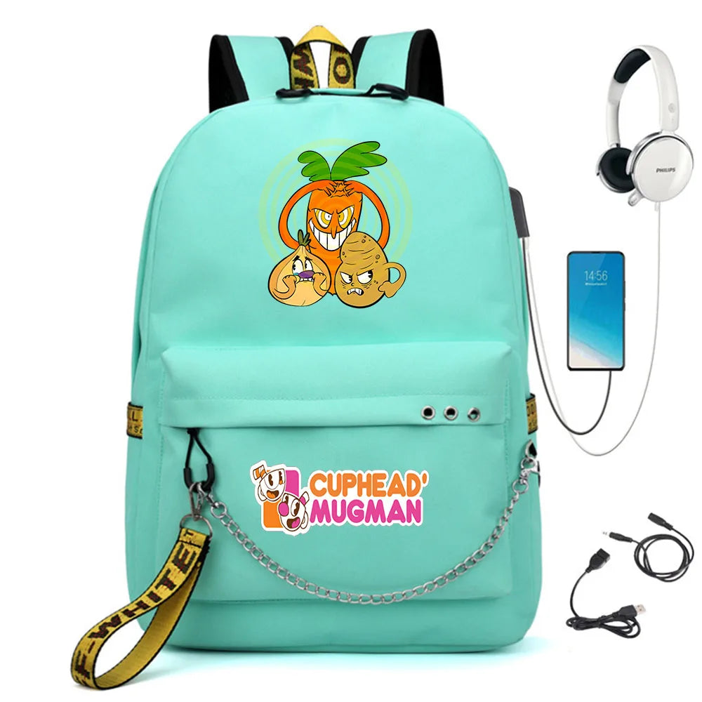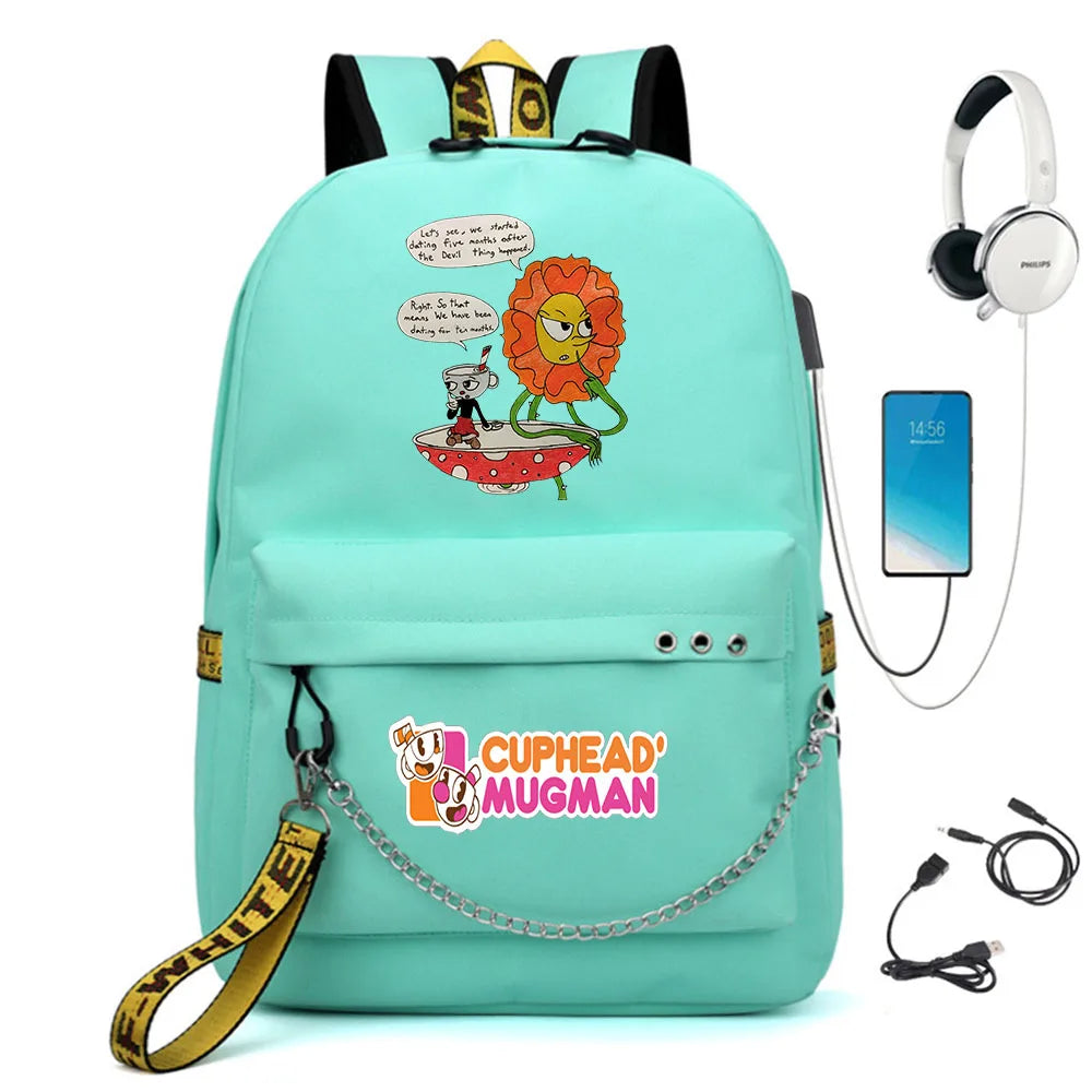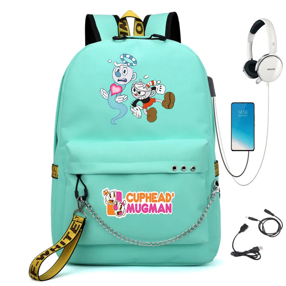 This nylon backpack features a unique Cuphead cartoon design, suitable for students and teenagers. It includes a USB charging port and is perfect for carrying laptops and books.