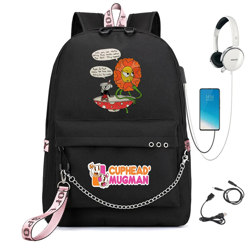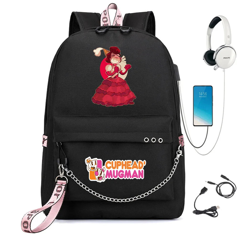 Cuphead Print Backpack USB Charging Headphone Teenagers Student Schoolbag