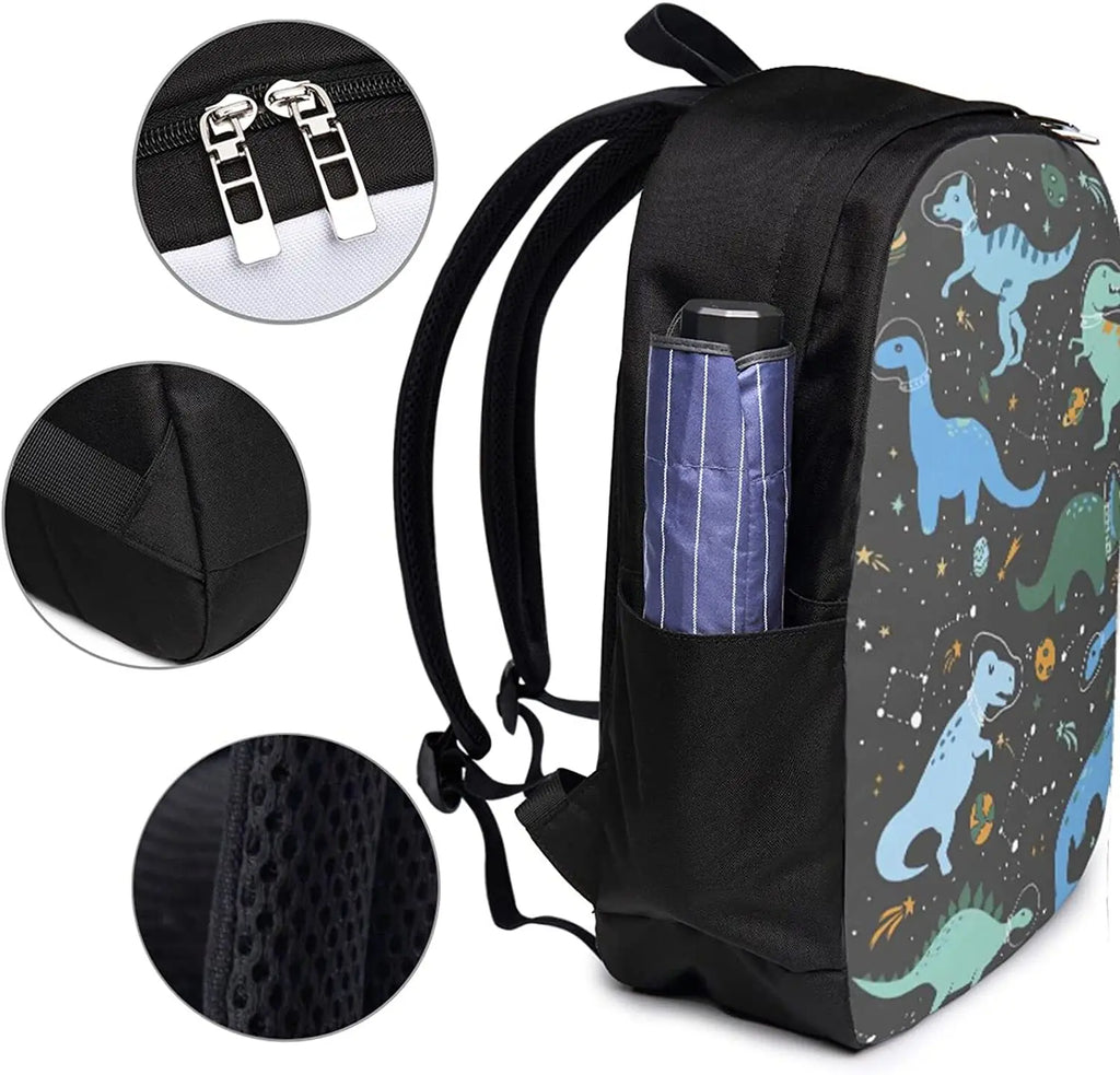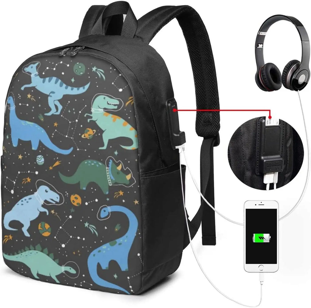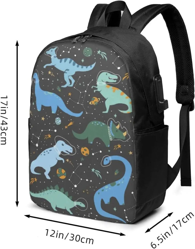 This 17-inch laptop backpack features a fun dinosaur in space design. It is water-resistant and equipped with a USB charging port for convenience.