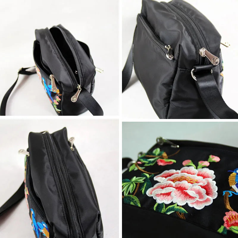 Stay stylish with this national small embroidery shopping handbag featuring lovely floral prints. This all-match canvas bag has multiple zippers and is perfect for everyday use.