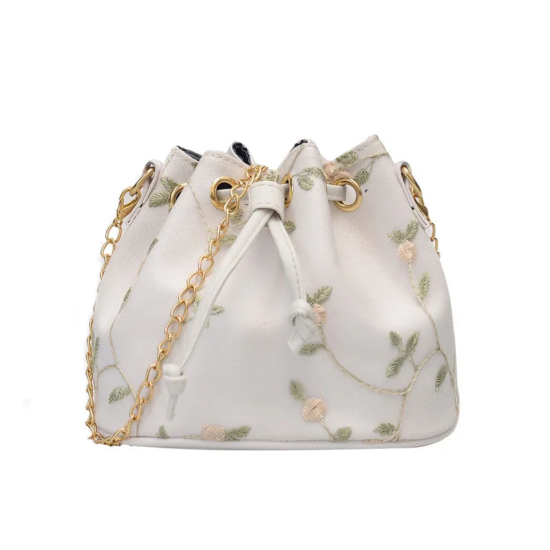 This crossbody bucket bag features delicate embroidery and a drawstring closure. It can be worn as a shoulder bag or a messenger bag, perfect for everyday use.