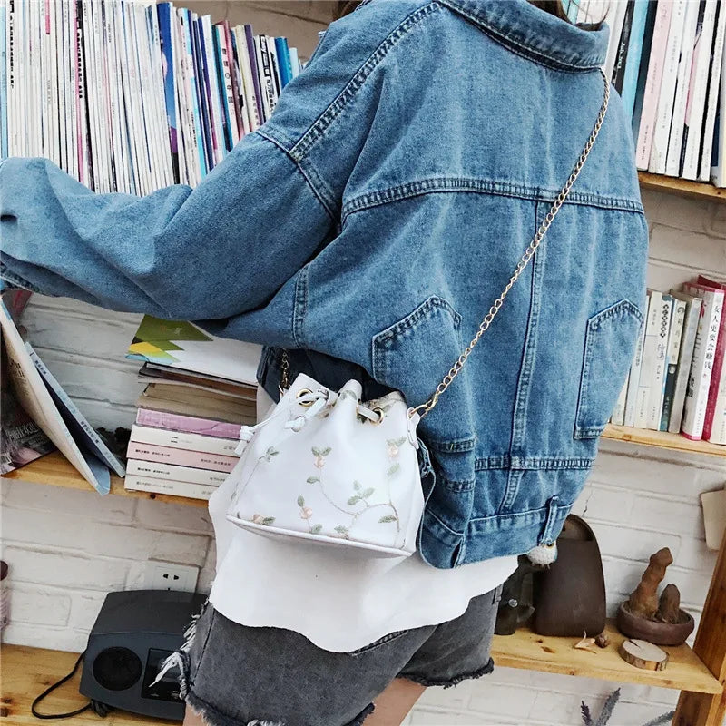 Embroidery Crossbody Bucket Bag Drawstring Messenger Handbag