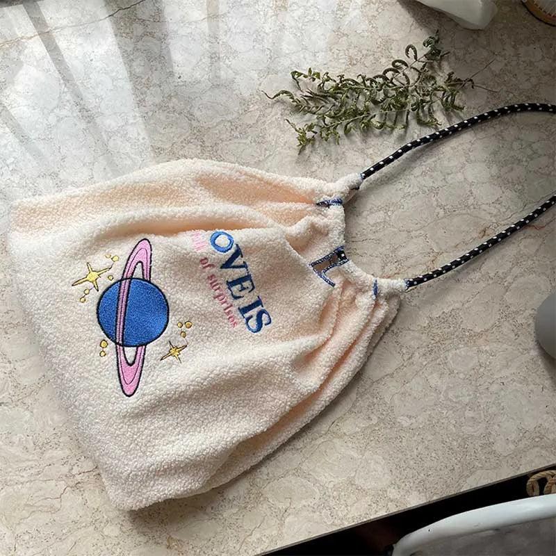 Stay stylish and cozy with this autumn and winter universe embroidered tote bag. Made of lamb wool with a large capacity for all your essentials.