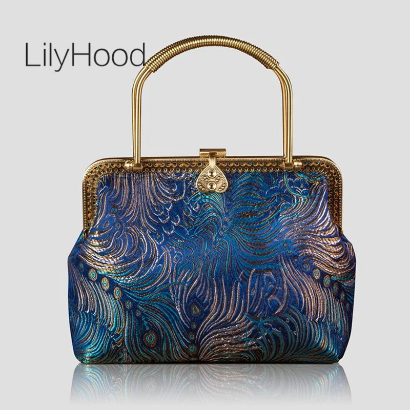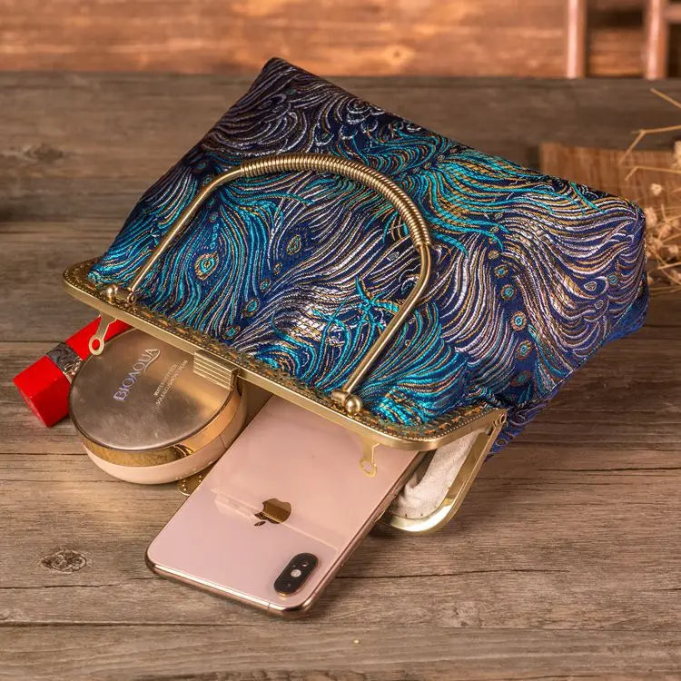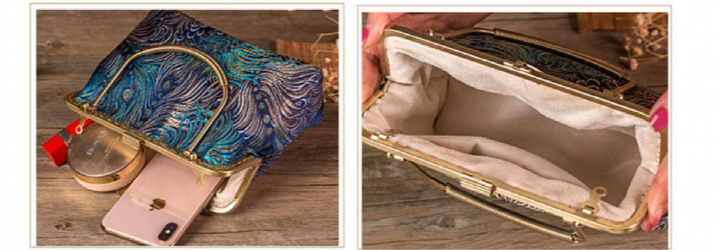 Fem. Satin Peacock Hanfu Sling Bag Chin. Kisslock Shoulder