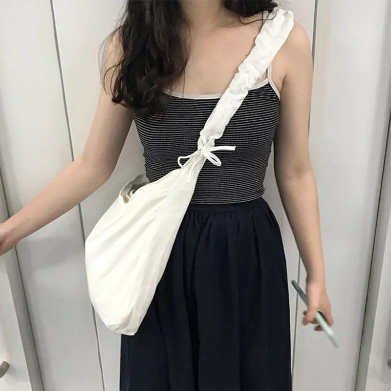 This stylish canvas bag is perfect for female students. It features a wide shoulder strap and a drawstring closure for convenient use.